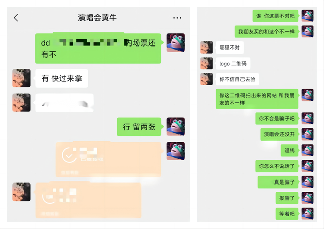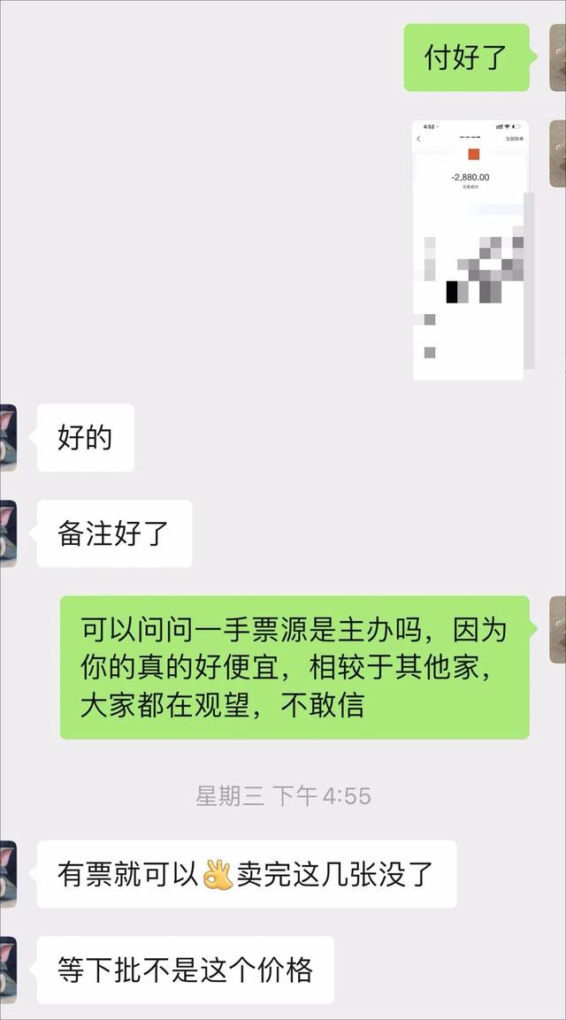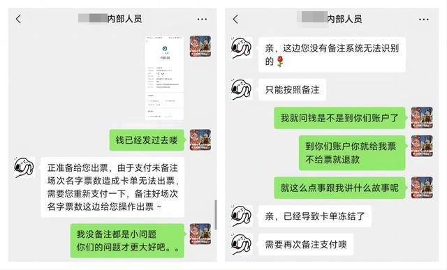 在演唱会官方门票开售前夕,骗子到处宣称有官方的售票渠道,或者是内部人员,可以买到非常紧俏的门票,吸引粉丝上钩。等歌迷准备买票时,他们会以定金、辛苦费等各种理由要求支付价款,甚至说卡单了需要重新备注支付才能出票,以此骗取更多钱财。等歌迷发现被骗要求退款时,已被拉黑,无法联系上“内部人员”。