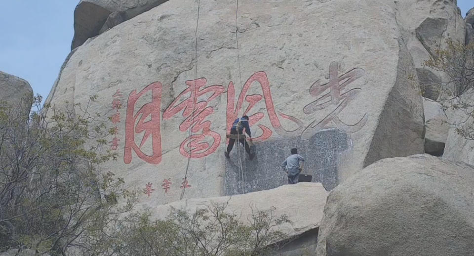 近日,峄山风景区境内悬崖峭壁上再现“蜘蛛侠”,为“鳌”字、“光风霁月”等石刻进行描红保护。
