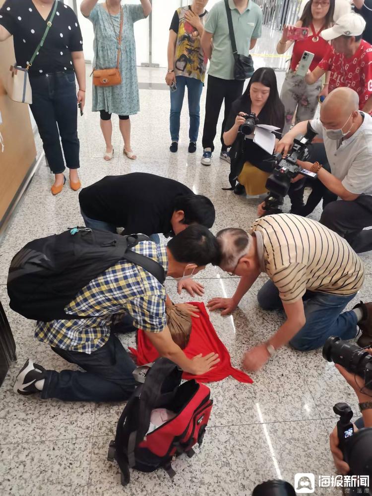 4月17日下午6时45分许,看到刘德文出现在机场到达大厅,红了眼眶的唐清泽兄弟俩,马上迎了上去,紧紧握住刘德文的双手。三人缓缓跪下,刘德文小心翼翼把装着骨灰盒的背包放在地上,打开背包取出了用红布精心包裹着的唐毅奇的骨灰盒。