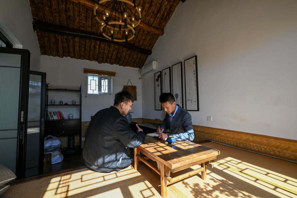 3月1日,在天津市宁河区廉庄镇木头窝村,王宇豪(左)与廉庄镇工作人员在村里一家民宿样板间内讨论。新华社记者孙凡越摄