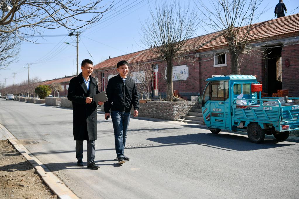 3月1日,在天津市宁河区廉庄镇木头窝村,王宇豪(左)正在去往新建民宿的路上。新华社记者孙凡越摄