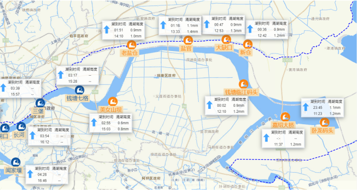 第一个点位,观赏的是盐官一线潮;第二个点位,观赏的是老盐仓回头潮,第三个点位,观赏的是美女坝回头潮,直播结束时间为3点30分。