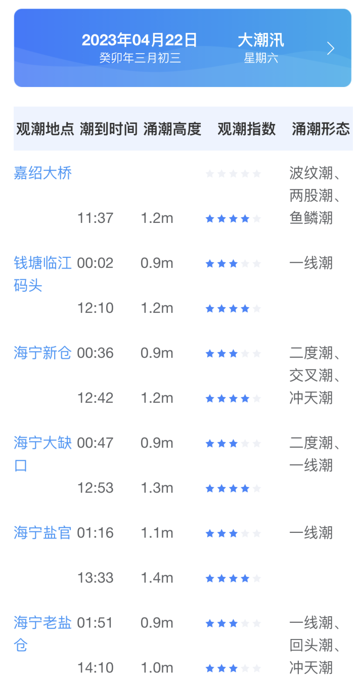 根据涌潮预报,今天,老盐仓、盐官美女坝等地的观潮等级,分别达到四星和三星,最高涌高1.4米。