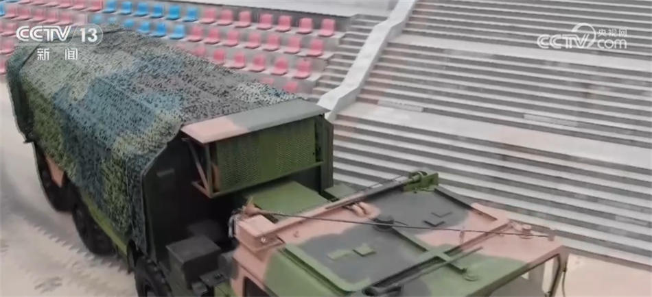 总台央视记者苏洲:接下来我们看到的这辆车就是导弹发射车,这是该岸导武器系统主要组成车辆之一。现在发射车已经起竖,在战时可采取单射和齐射的方式对几百公里外的目标进行精准打击。大家可以看到这个型号的车体积还是比较庞大的,轮胎就有1米多高,使用的防爆材质可以让发射车具备极强的越障、越壕、涉水能力。