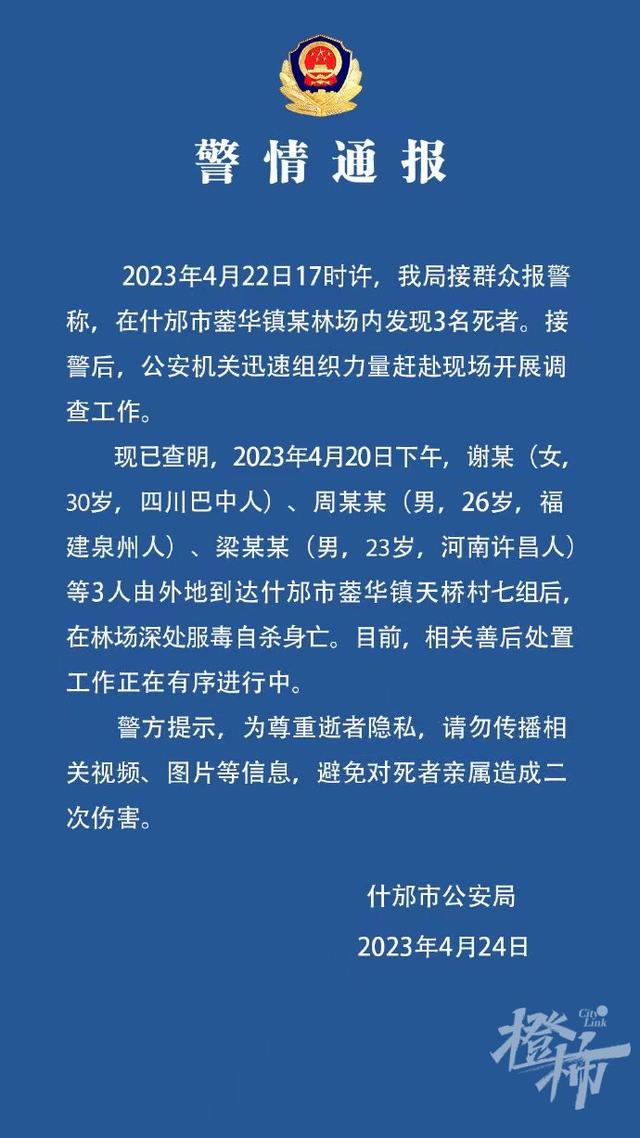 今天凌晨,四川什邡市公安局发布警情通报称,4月22日下午5点左右,接到群众报警,在什邡市蓥华镇某林场内发现三名死者,分别来自四川、福建、河南三个省市。