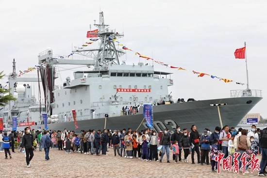 4月22日,山东青岛,海军成立纪念日舰艇开放活动上,观众排队等待登舰参观。