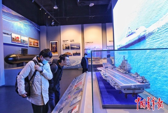 4月23日,山东青岛,观众在海军博物馆内观看辽宁舰模型。