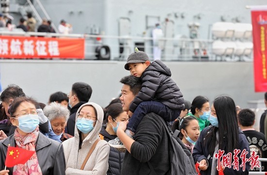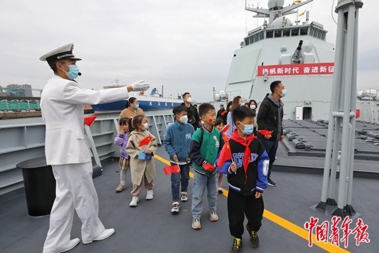 在他的不远处,青岛港3号码头上,3名身穿迷彩外套的孩子站在一块“打卡点”标志牌下拍照留念,牌子上的标语写着“情系浪花白,最爱海军蓝”。而走下舰艇的管晓红,给远在部队正参加专业培训的儿子发去一条信息,万千感慨化作一句简短干脆的叮嘱:“同学,加倍努力!”