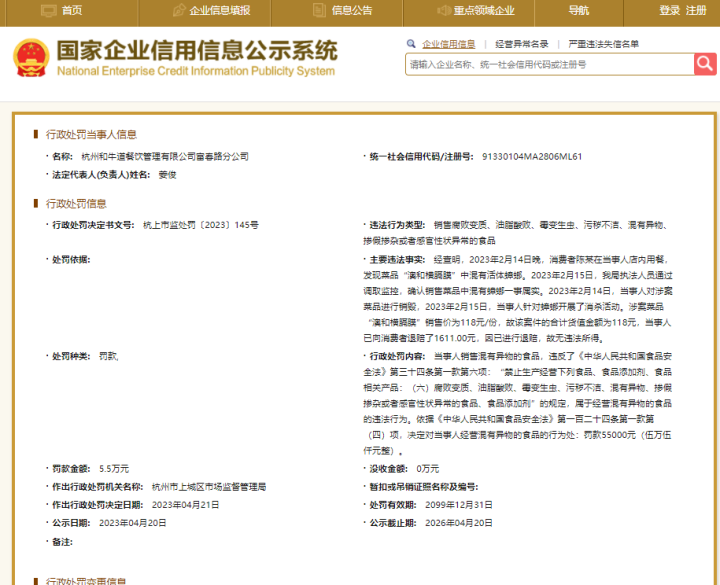 天眼查信息显示,近日,网红烤肉店御牛道关联公司杭州和牛道餐饮管理有限公司富春路分公司因菜品中出现活蟑螂,被杭州市上城区市场监督管理局罚款5.5万元。