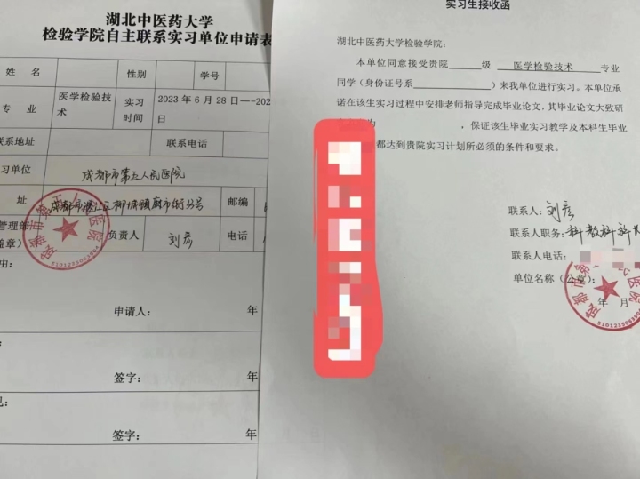 《湖北中医药大学检验学员自主联系实习单位申请表》与《实习生接收函》。图源:聊天记录截图。