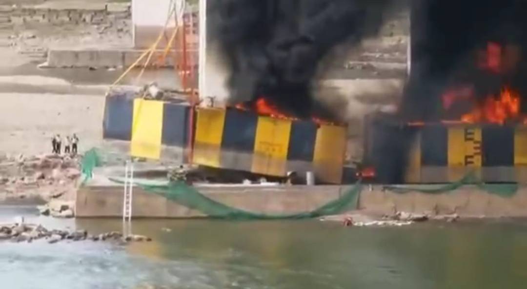 黄花园大桥桥墩基座施工处燃起大火。视频截图