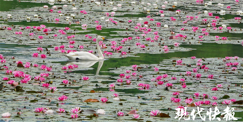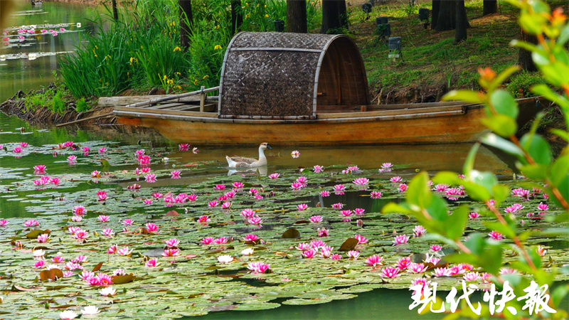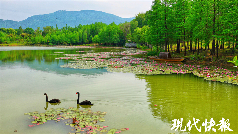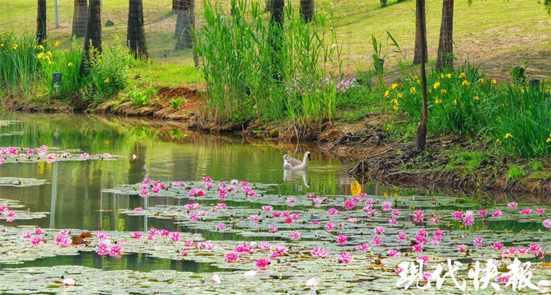 除了粉白的睡莲,此时水杉也焕发新绿,水上、岸边繁花盛放,映出古朴诗意。睡莲、夏花、林鸟、荷鱼、天鹅……犹如画家笔下的元素,将眼前的景色点缀得格外灵动。远山近水间,燕雀湖夏日之美初现。