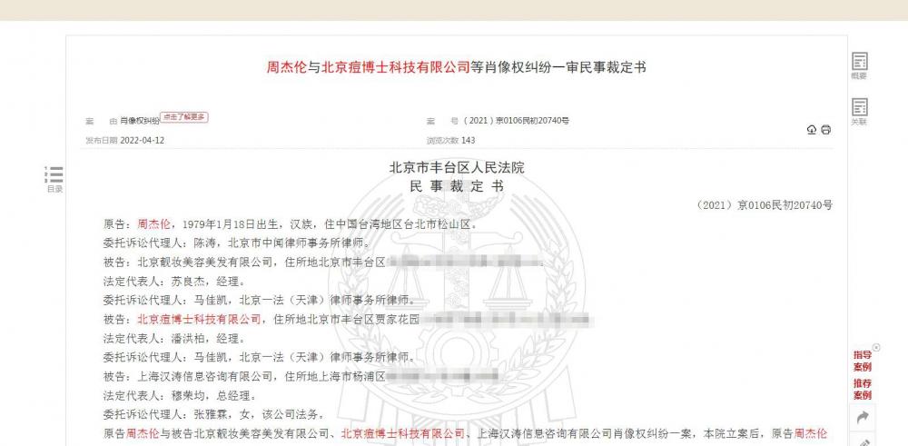 上述9份裁定书中,有一份涉及北京市丰台区法院。丰台区法院2021年12月31日作出的(2021)京0106民初20740号民事裁定书显示:“原告周杰伦与被告北京靓妆美容美发有限公司、北京痘博士科技有限公司、上海汉涛信息咨询有限公司肖像权纠纷一案,本院立案后,原告周杰伦于2021年12月28日向本院提出撤诉申请。本院裁定准许原告周杰伦撤诉。”该裁定书中,未提及周杰伦撤诉原因,也未披露双方肖像权纠纷的具体细节。