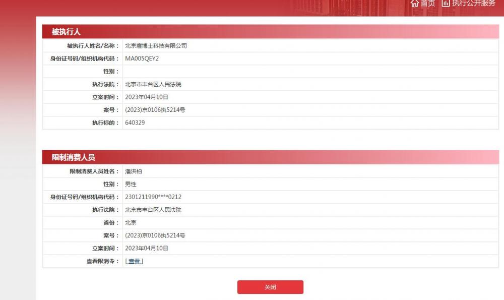 中国执行信息公开网信息显示,北京市丰台区法院4月28日发布的限制消费令称,该院于2023年4月10日立案执行“周杰伦申请执行北京痘博士科技有限公司合同纠纷一案”,因该公司未按执行通知书指定的期间履行给付义务,法院依法对北京痘博士公司采取限制消费措施,限制该公司及法定代表人潘洪柏不得实施高消费及非生活和工作必需的消费行为。