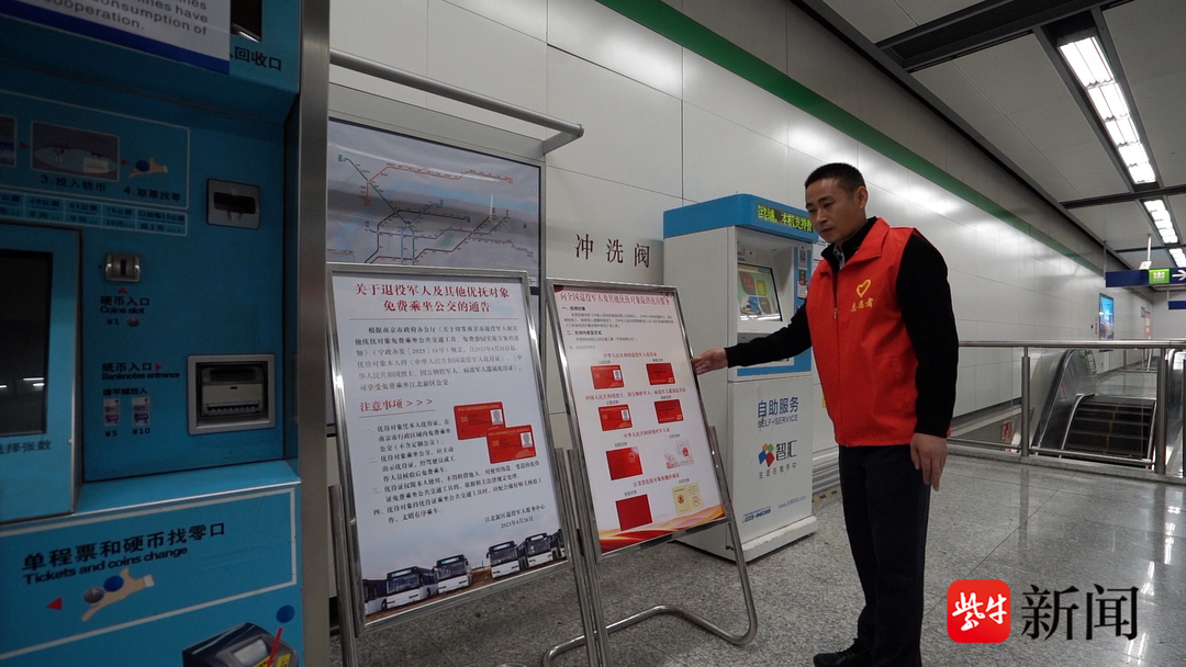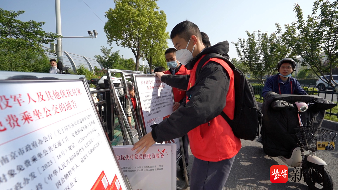 方案实施首日,一群红马甲忙碌在新区的各大地铁站口,他们摆放好宣传牌协助地铁站台工作人员一同指引着来往手持优待证的人群通过绿色通道。当天上午,南京市退役军人事务局副局长魏爱根、江北新区卫生健康和民政局副局长胡虹来到江北新区人流量最大的公交站台和柳州东路地铁站进行督导。魏爱根局长提出,各区局要大力推广宣传优待证免费入园、免费乘坐公共交通的流程,尤其在重要交通场站,多种形式做好指引服务。
