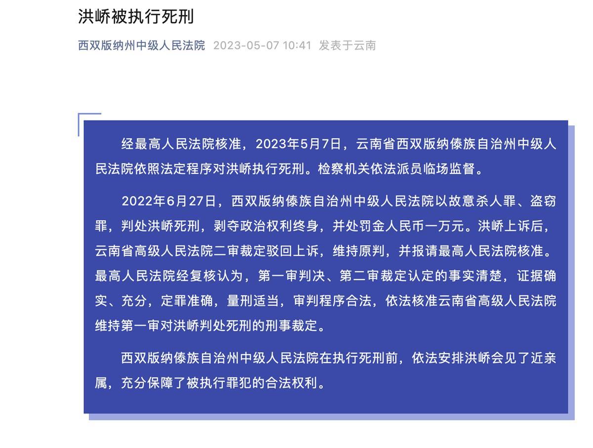 5月7日上午,西双版纳州中级人民法院发布消息称,经最高人民法院核准,2023年5月7日,云南省西双版纳傣族自治州中级人民法院依照法定程序对洪峤执行死刑。检察机关依法派员临场监督。