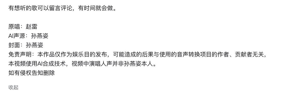 不过,如不属于合理使用、法定许可或者公共领域的歌曲都需要取得歌曲权利人授权。对于Ed_d_d_d强调的是否商用,袁春松解释称:“我国《著作权法》对合理使用的情形进行了有限列举,仅仅‘不商用’难以判断是否侵权,只有具体情况符合了《著作权法》列举的合理使用情形才可规避侵权风险。但实际上,由于流量常常和经济利益挂钩,通过上传‘AI孙燕姿’翻唱的歌曲赚取流量从而获得经济利益的博主们,就很难称得上是不商用。”