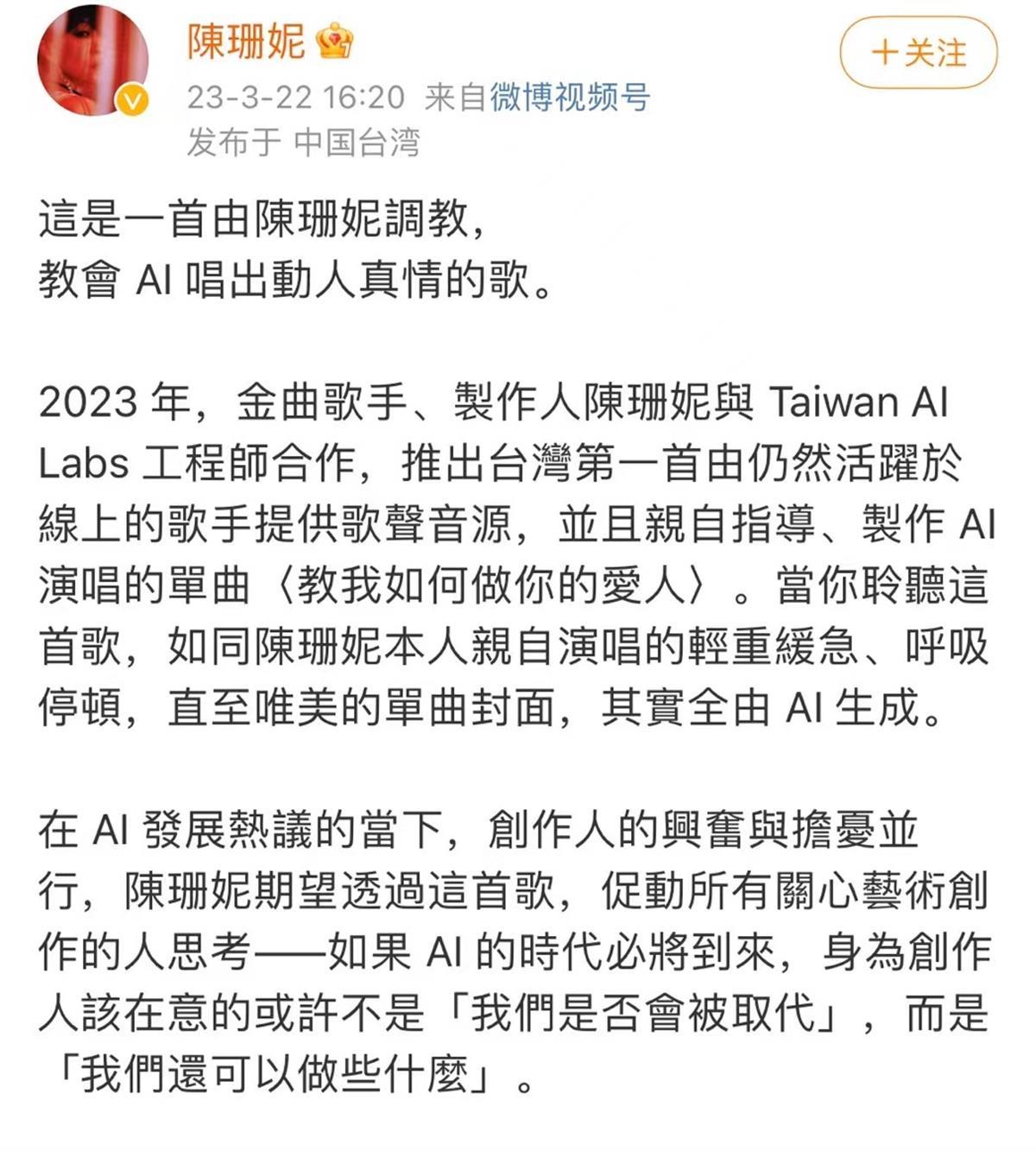 歌手陈珊妮也在今年3月14日发布了“AI陈珊妮”演唱的《教我如何做你的爱人》,发布语中介绍“2023年,金曲歌手、制作人陈珊妮与TaiwanAILabs工程师合作”,“在AI发展热议的当下,创作人的兴奋与担忧并行,陈珊妮希望透过这首歌,促动所有关心艺术创作的人思考——如果AI的时代必将到来,身为创作人该在意的或许不是‘我们是否会被取代’,而是‘我们还可以做些什么’。”