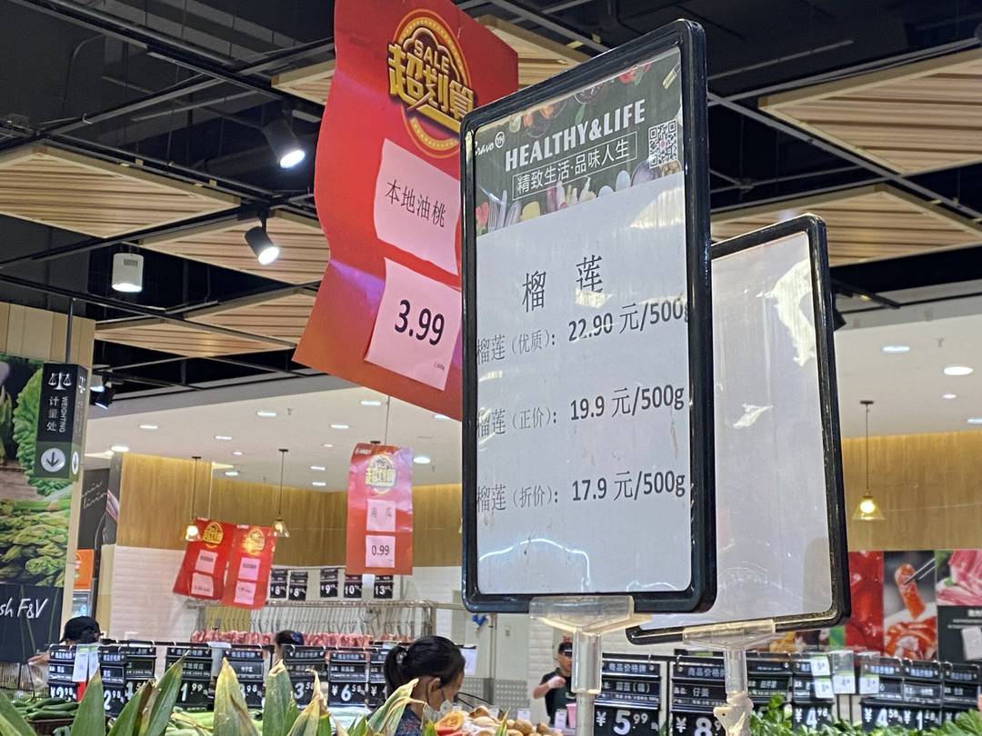 为何超市榴莲如此便宜?“果型不太好的就会搞活动卖17.9元/斤或者19.9元/斤,品质好点的22元/斤,其实口感都一样,我们每年搞活动最低价也是19.9元/斤,因为集中采购量大,主要是为了吸引客流量”,超市工作人员说。