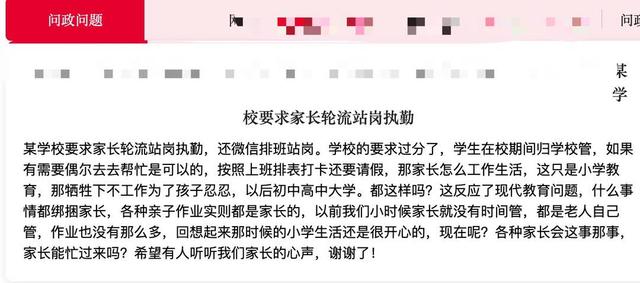 “某学校要求家长轮流站岗执勤”的投诉信息在网络上传播。