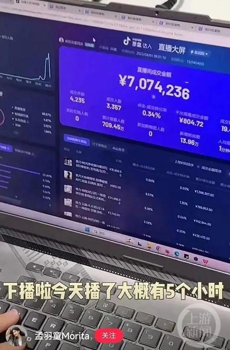 上游新闻从视频画面中看到,笔记本电脑显示的“直播间成交金额”为7074236元。