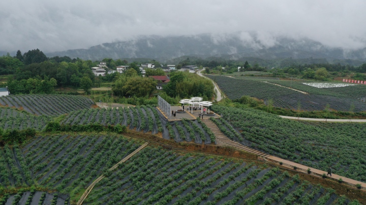 两天前的北川飘起了毛毛细雨,新县城周边的山顶笼罩着厚厚的云雾。在北川县永昌镇福田村,潮新闻记者见到了在这里开花结果的浙江蓝莓,以及一间开在田边的直播间。
