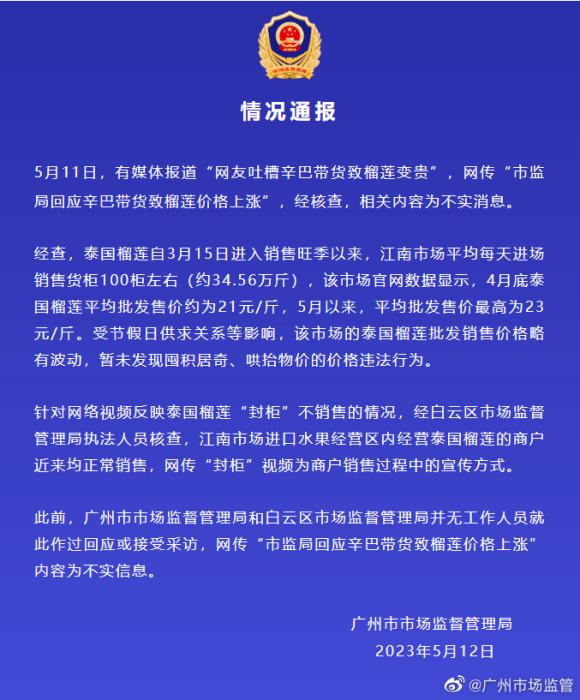 5月12日,广州市市场监督管理局发布情况通报:5月11日,有媒体报道“网友吐槽辛巴带货致榴莲变贵”,网传“市监局回应辛巴带货致榴莲价格上涨”,经核查,相关内容为不实消息。