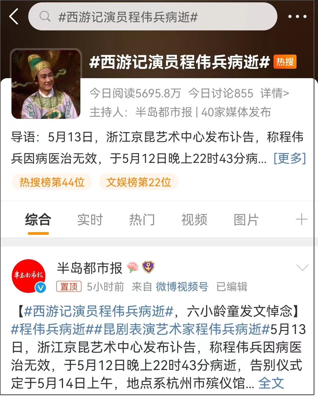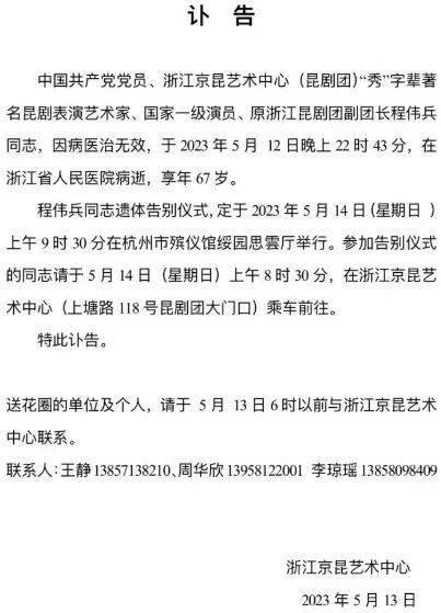 5月13日,浙江京昆艺术中心发出讣告,中国共产党党员、浙江京昆艺术中心(昆剧团)“秀”字辈著名昆剧表演艺术家、国家一级演员、原浙江昆剧团副团长程伟兵同志,因病医治无效,于2023年5月12日晚上22时43分在浙江省人民医院病逝,享年67岁。