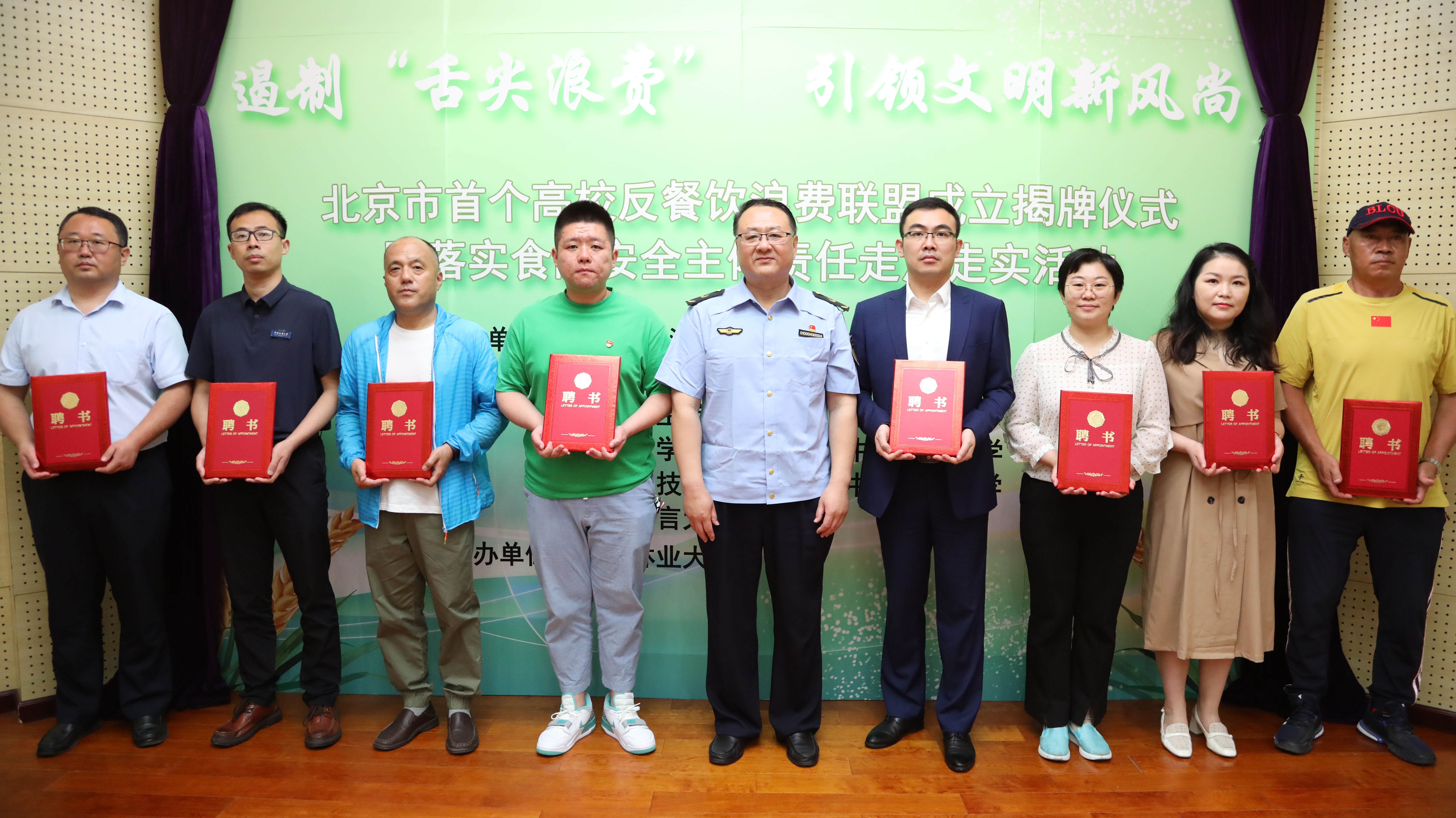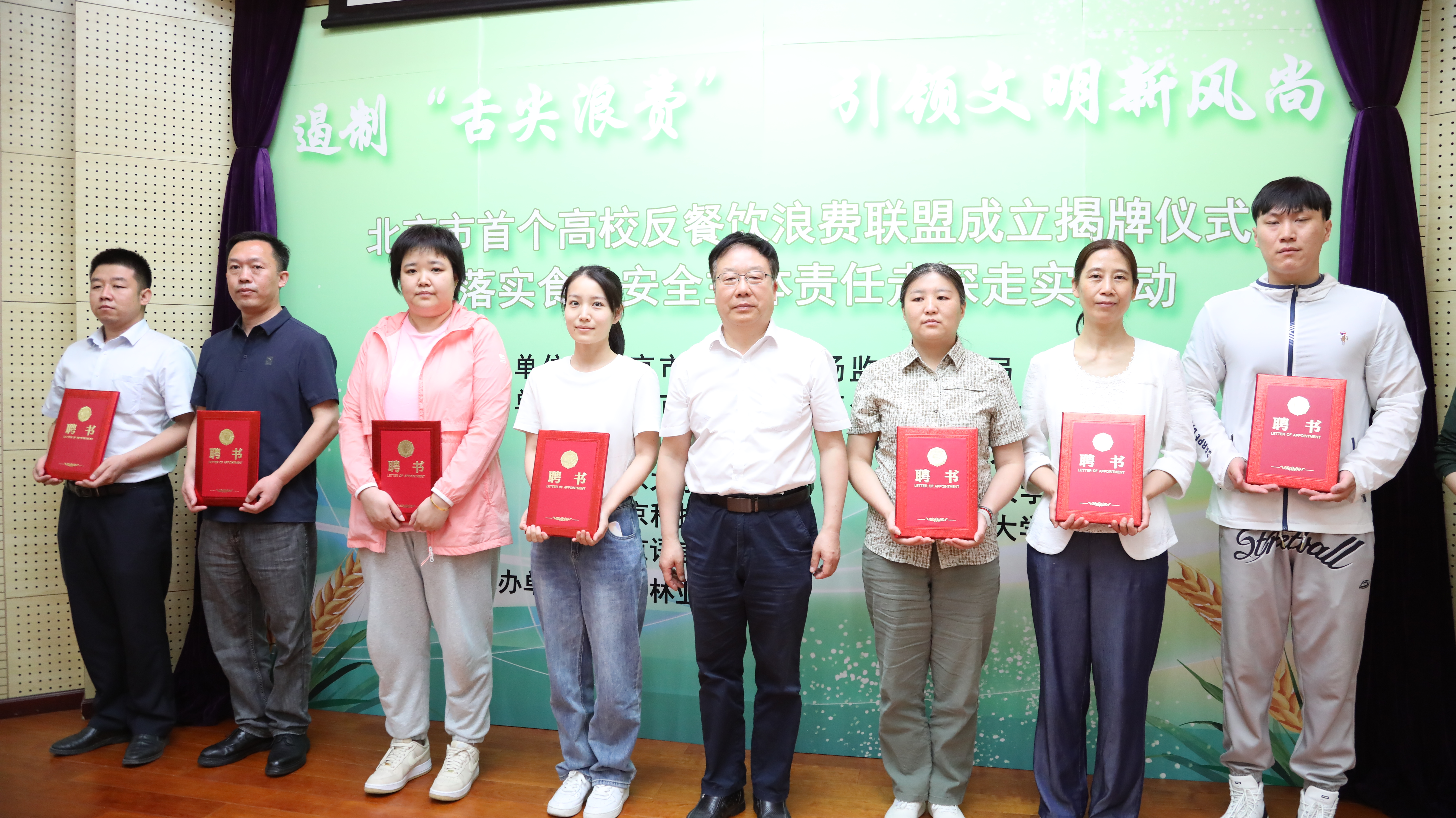 随后,北京市市场监管局二级巡视员、北京市私营个体经济协会会长于爽,北京林业大学党委副书记谢学文、北京市私营个体经济协会副秘书长姜平,海淀区市场监管局党组成员、副局长卢砚京为8所高校的食品安全员、安全总监及文明用餐宣传员代表颁发聘任证书。