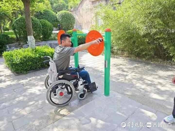 记者注意到,此区域的健身器材普遍较为低矮,有的器械还能容纳下轮椅尺寸,方便特殊人群使用。“这个器材就是为坐轮椅的朋友锻炼设置的,既可以锻炼下肢力量,也可以同时锻炼手臂。”现场工作人员指着一部器材介绍说。