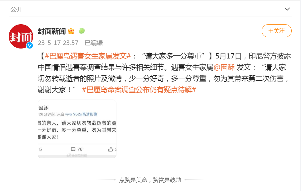 每日经济新闻消息,5月17日,印尼警方披露中国情侣遇害案调查结果与许多相关细节。17日深夜,遇害女生家属@囡穌发文:“请大家切勿转载逝者的照片及微博,少一分好奇,多一分尊重,勿为其带来第二次伤害,谢谢大家!”