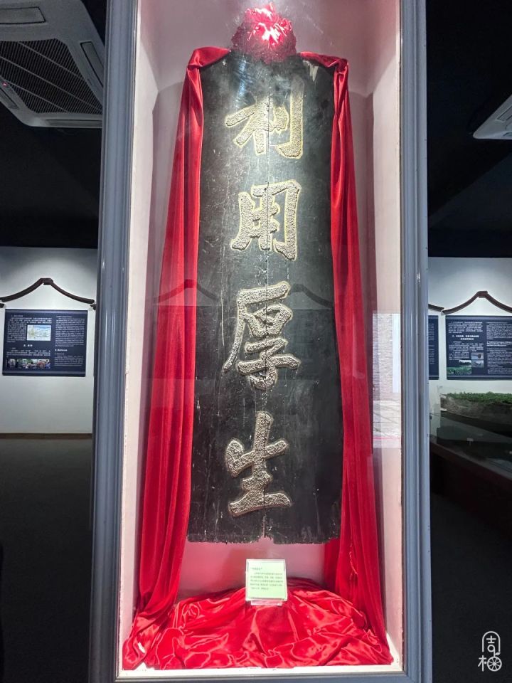 展馆内竖有一块刻着“利用厚生”字样的石碑,便是明清时期,荻港老祖宗为保护和赞颂桑基鱼塘生态循环系统特刻的碑文,意为“福利大用,厚泽众生”。