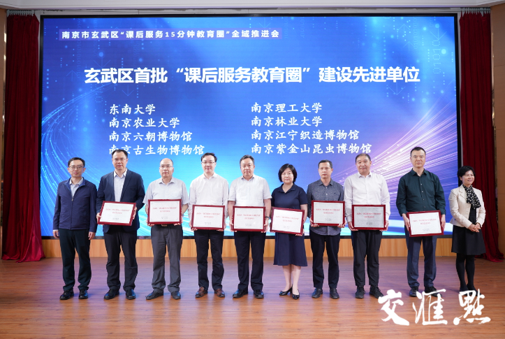 近一年,各中小学校在区内文博、高校科研院所等单位支持下,充分利用“15分钟教育圈”资源,创造性地开展实践育人活动,涌现了一批先进典型。现场,包括东南大学、南京理工大学、南京农业大学、南京林业大学、江苏省农业科学院、南京博物院、南京六朝博物馆、江宁织造博物馆等25家首批玄武区“课后服务15分钟教育圈”建设先进单位获得了授牌。