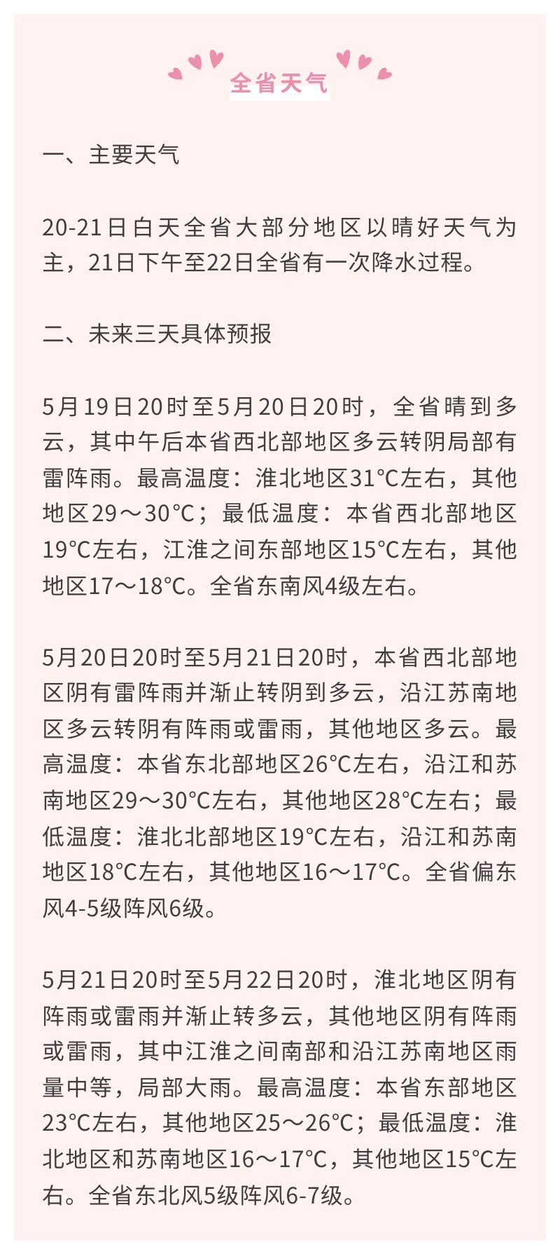 具体预报:20日至21日白天全省大部分地区以晴好天气为主,21日下午至22日全省有一次降水过程。5月19日20时至5月20日20时,全省晴到多云,其中午后本省西北部地区多云转阴局部有雷阵雨。最高温度:淮北地区31℃左右,其他地区29~30℃;最低温度:本省西北部地区19℃左右,江淮之间东部地区15℃左右,其他地区17~18℃。全省东南风4级左右。