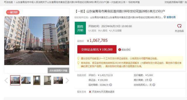 据京东法拍显示,位于青岛市黄岛区温州路198号(欧美世纪花园小区)的20套住宅将于5月26日进行二次法拍,该小区的36套住宅将于6月19日进行首次拍卖,同时有56套房产上拍,该小区引起了不少网友的关注,记者从京东法拍平台获悉,目前已有万余名网友围观,三家金融机构提供法拍贷。记者从京东法拍平台了解到,今年来,青岛两级法院共计上拍494套住宅,综合成交率71.3%。