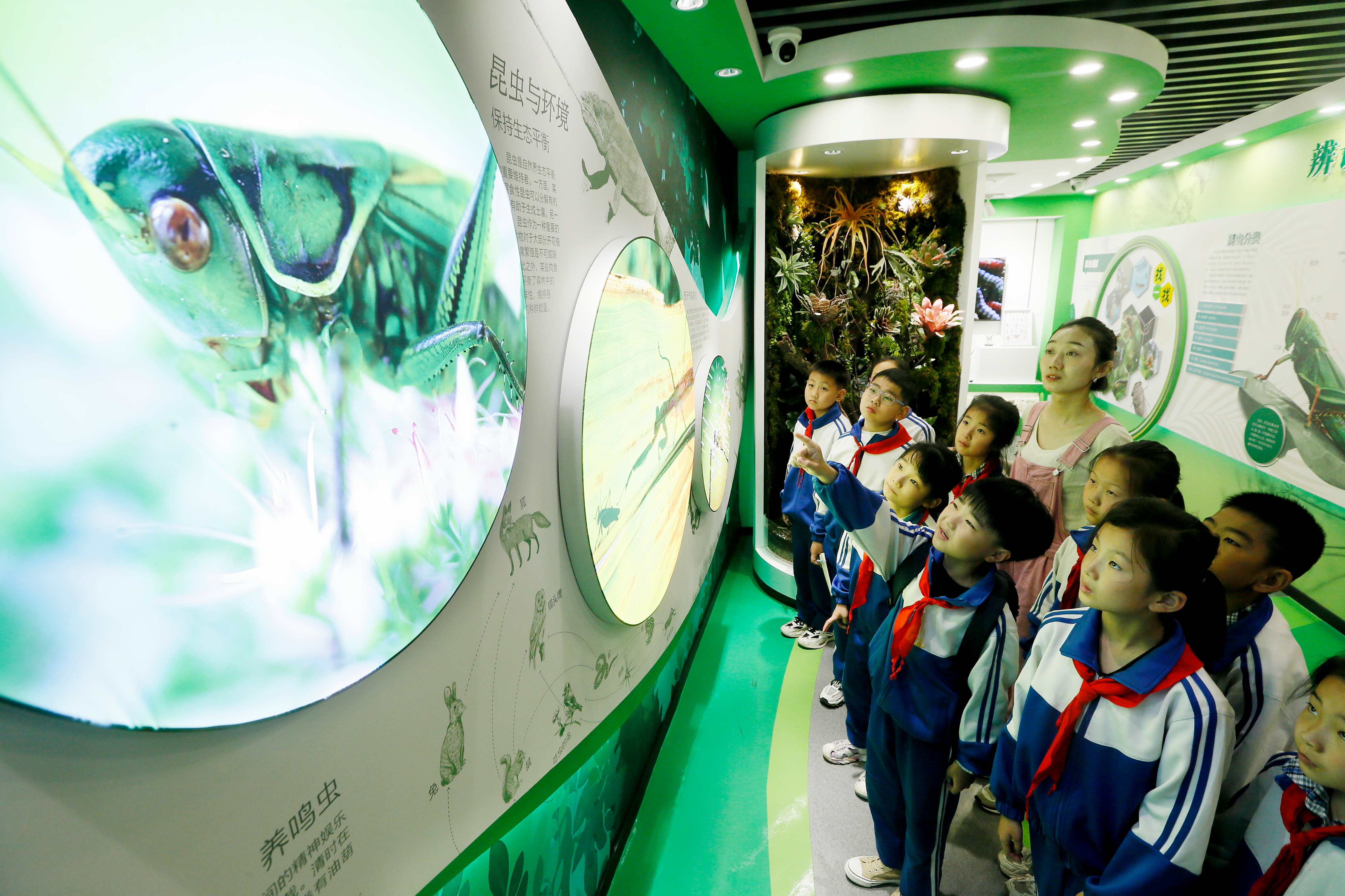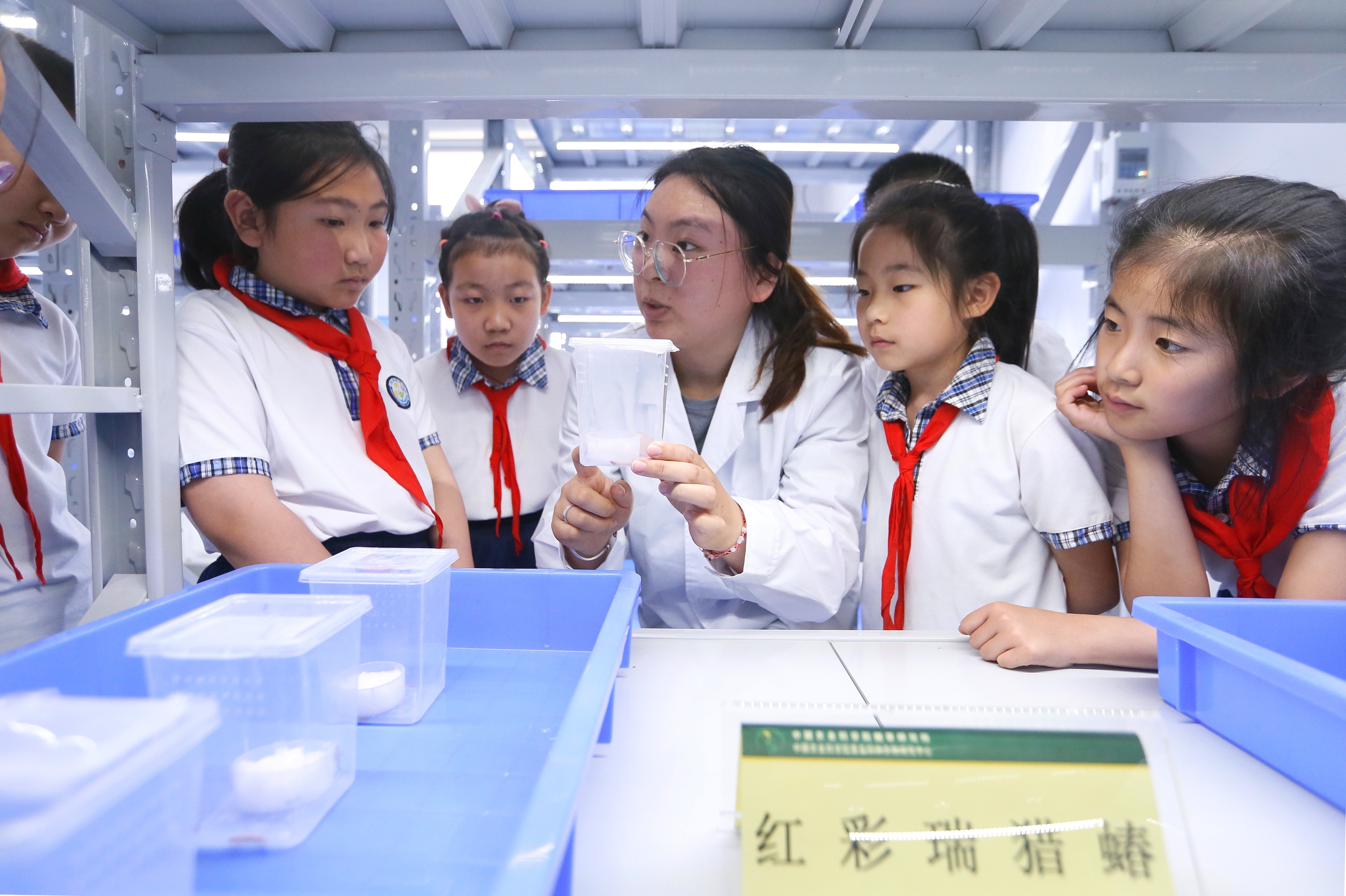 5月22日,在中国农科院青岛特种作物研究中心试验基地科普馆,工作人员为小学生讲解农作物害虫绿色防控技术。梁孝鹏摄