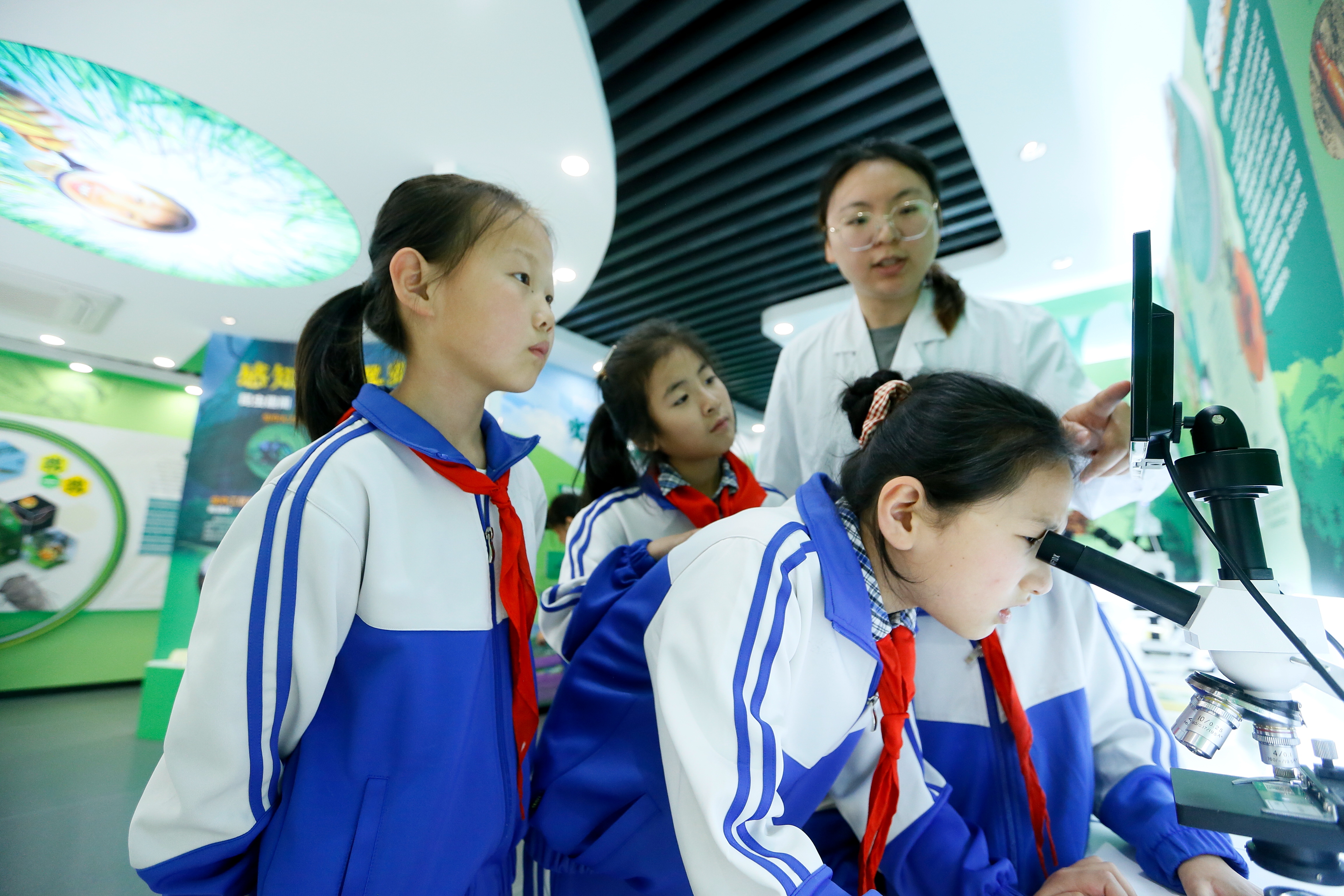 5月22日,在中国农科院青岛特种作物研究中心试验基地科普馆,青岛市即墨区小学生用显微镜观察生物昆虫玻片标本。梁孝鹏摄