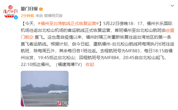 5月22日傍晚18:17,福州长乐国际机场往返台北松山机场的客运航线正式恢复运营,首班福州至台北松山航班由@厦门航空 直飞。这也是自疫情以来,福州时隔三年重新恢复往返台湾地区的第一条直飞客运航线。根据计划,自今日起,厦航福州-台北松山航线将每周执行6班往返航班,除每周五外,其余每日各1班往返。去程航班号为MF883,每日18:15自福州出发,19:45抵达台北松山;回程航班号为MF884,20:45自台北松山起飞,22:10抵达福州。(福建海博TV)