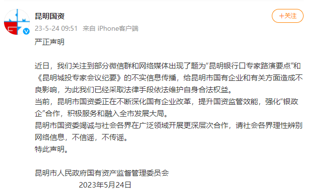 近日,我们关注到部分微信群和网络媒体出现了题为“昆明银行口专家路演要点”和《昆明城投专家会议纪要》的不实信息传播,给昆明市国有企业和有关方面造成不良影响,为此我们已经采取法律手段依法维护自身合法权益。