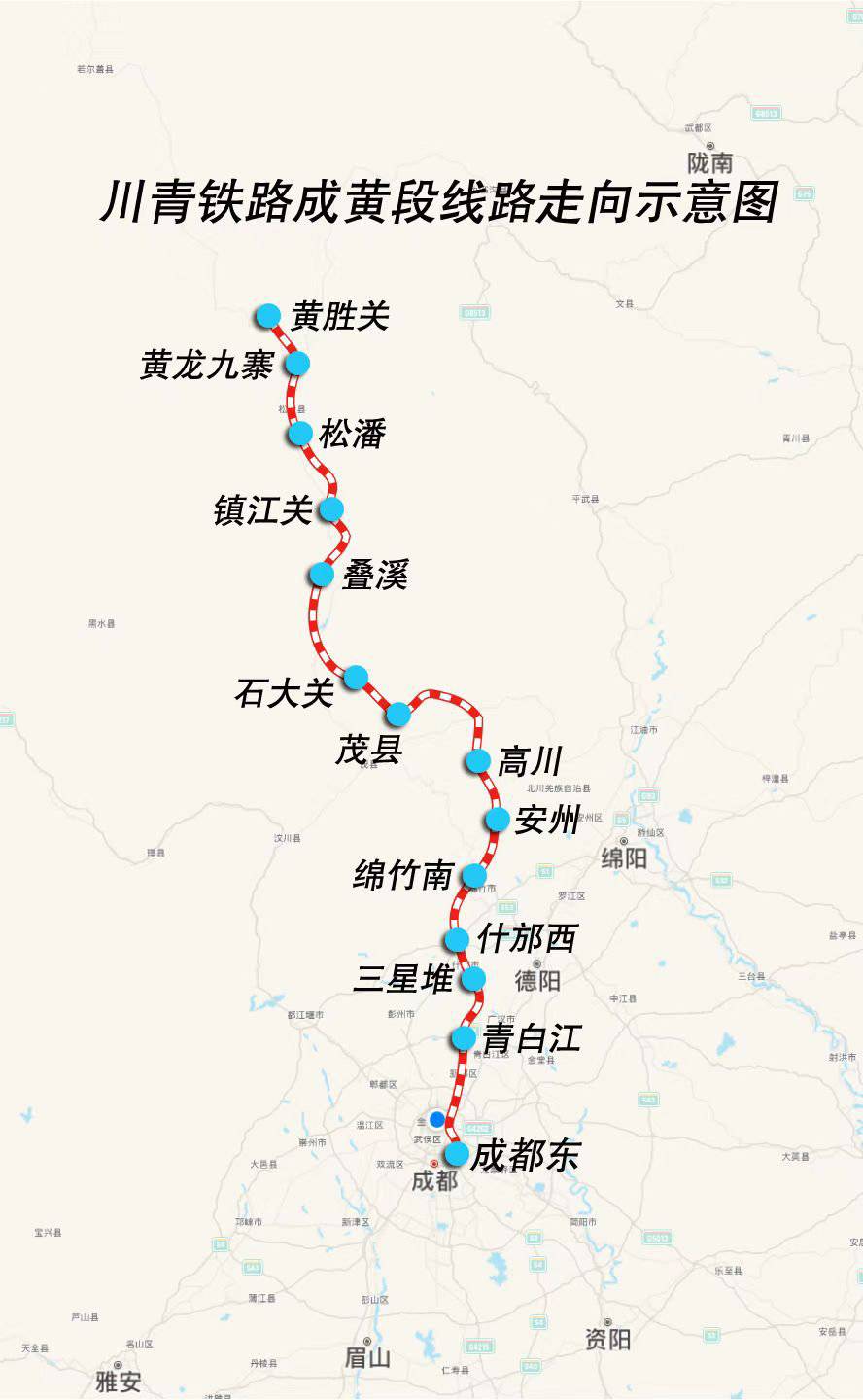 成都局集团介绍,原成兰铁路四川段现已更名为川青铁路青白江至黄胜关段,简称川青铁路成黄段。根据最新线路走向图,沿线车站包括青白江(既有)、三星堆、什邡西、绵竹南、安州、高川、茂县、石大关、叠溪、镇江关、松潘、黄龙九寨、黄胜关。其中,安州原名安县,石大关原名龙塘,叠溪原名太平,黄龙九寨原名川主寺。