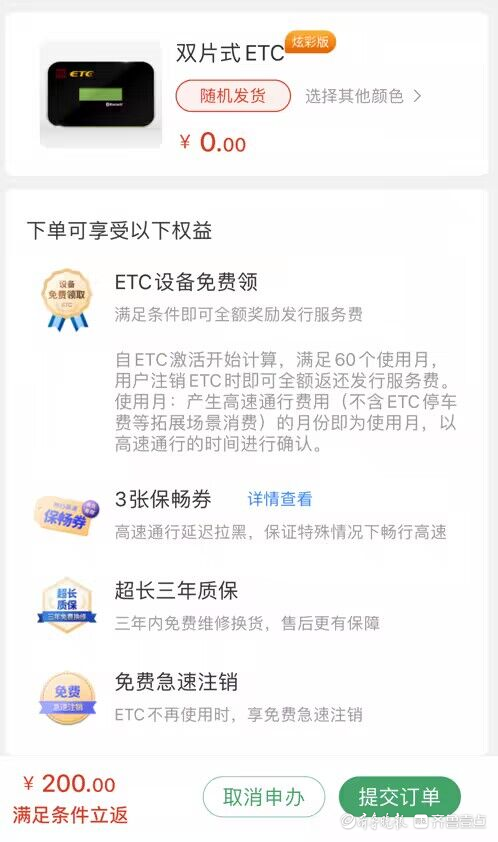 日前,青岛市民李先生车上安装的ETC设备突然损坏,他便来到当初办理的建设银行青岛某网点咨询,工作人员告诉他现在银行已经没有了办理ETC设备的资质,渠道已经被山东高速收回,所以无法为李先生提供质保。在银行工作人员的协助下,李先生只能将之前的ETC设备进行注销,再从山东高速官方APP上重新申请。“本来我觉得也没什么,但是操作一番之后我觉得不对味儿了。”李先生说,在山东高速官方APP办理ETC的服务界面,多处显示“免费”“0元”,但是最后要提交的时候则需要支付200元的“发行服务费”。“上面写着达到一定条件可以返还这个费用,但我仔细一看惊掉了下巴。”李先生说,返还费用的条件非常苛刻,要使用满60个自然月且用户注销ETC时才可以返还,即使用不足5年或者使用满5年但继续使用ETC设备的用户均不符合退款条件。“我就觉得高速这么干有点恶心,又收取高额的服务费,又冠冕堂皇地说免费,还不如明码实价来得痛快。”李先生说。