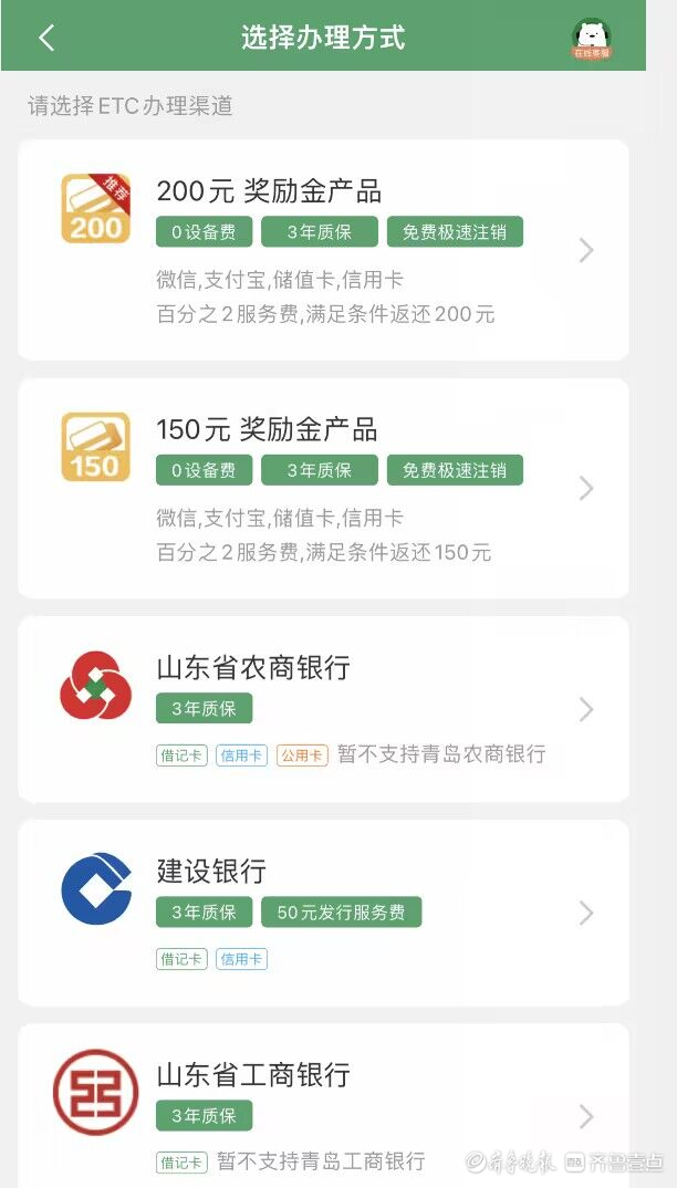 针对李先生反映的问题,记者下载并登录了山东高速官方APP“e高速”,进入ETC办理界面,确实有醒目的“免费领”字样,点击进入之后,APP里也出现多处“0元”“免费”提醒,但继续下一步则出现了5个不同的办理方式,其中农商银行和工商银行两项青岛地区不支持,另外两项要分别缴纳200元、150元发行服务费,建设银行选项收费最低,为50元。如李先生所说,发行服务费的返还条件为使用满60个自然月,且要在注销时才能返还。记者注意到,200元的服务费套餐包括三张“保畅券”“超长三年质保”“免费极速注销”等内容。