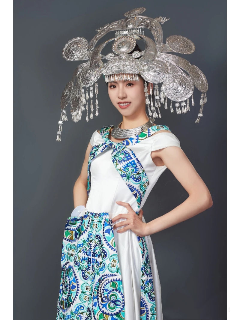 参加世界小姐比赛中,洪昊昀身着民族服饰。受访者供图