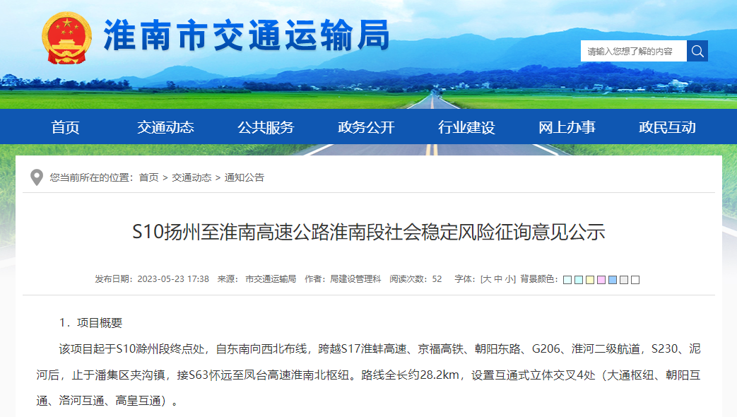 大皖新闻讯据淮南市交通运输局发布,S10扬州至淮南高速公路淮南段,正在征求意见。