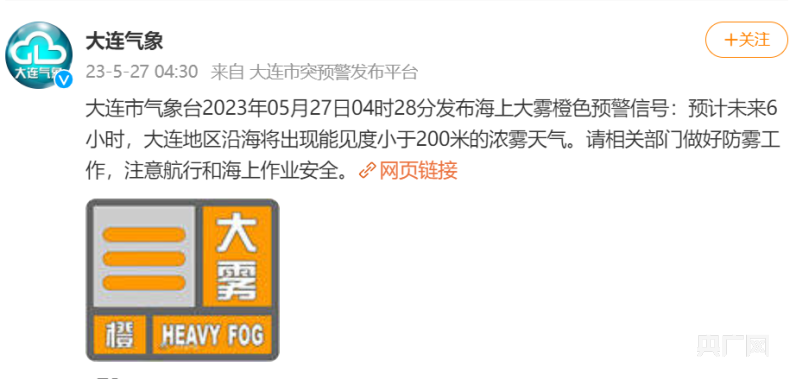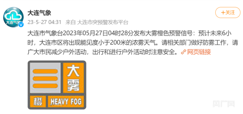 27日早6时30分,大连城区被浓雾笼罩。记者从大连市气象网查询到,大连市气象台于27日4时28分发布海上大雾橙色预警信号:预计未来6小时,大连地区沿海将出现能见度小于200米的浓雾天气;4时28分同步发布大雾橙色预警信号:预计未来6小时,大连市区将出现能见度小于200米的浓雾天气;5时33分发布大风蓝色预警信号:预计27日白天,大连市区东到东南风5到6级、阵风7级。