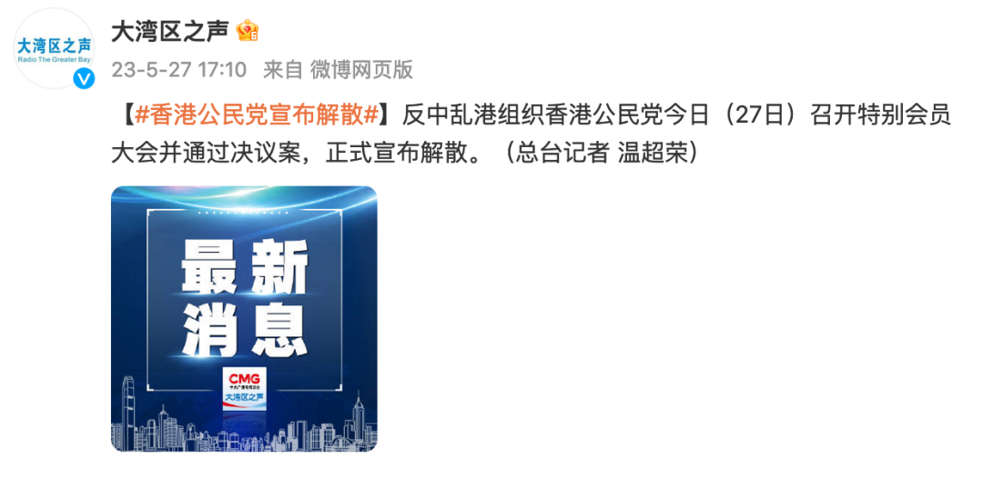 据@大湾区之声 消息,反中乱港组织香港公民党5月27日召开特别会员大会并通过决议案,正式宣布解散。