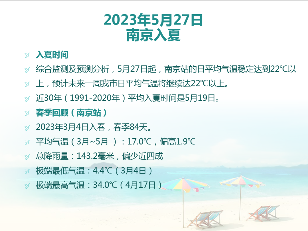 春天,拜拜啦!今年南京的春季共84天。根据江苏省气候中心此前对2001年-2020年江苏春季时长的统计,江苏春天平均持续68.7天。所以,84天算是比较长的春天了。不知大家还有没有印象,去年南京的春天就很长,据统计,2022年南京的春季足足有88天,是近10年最长的春天。