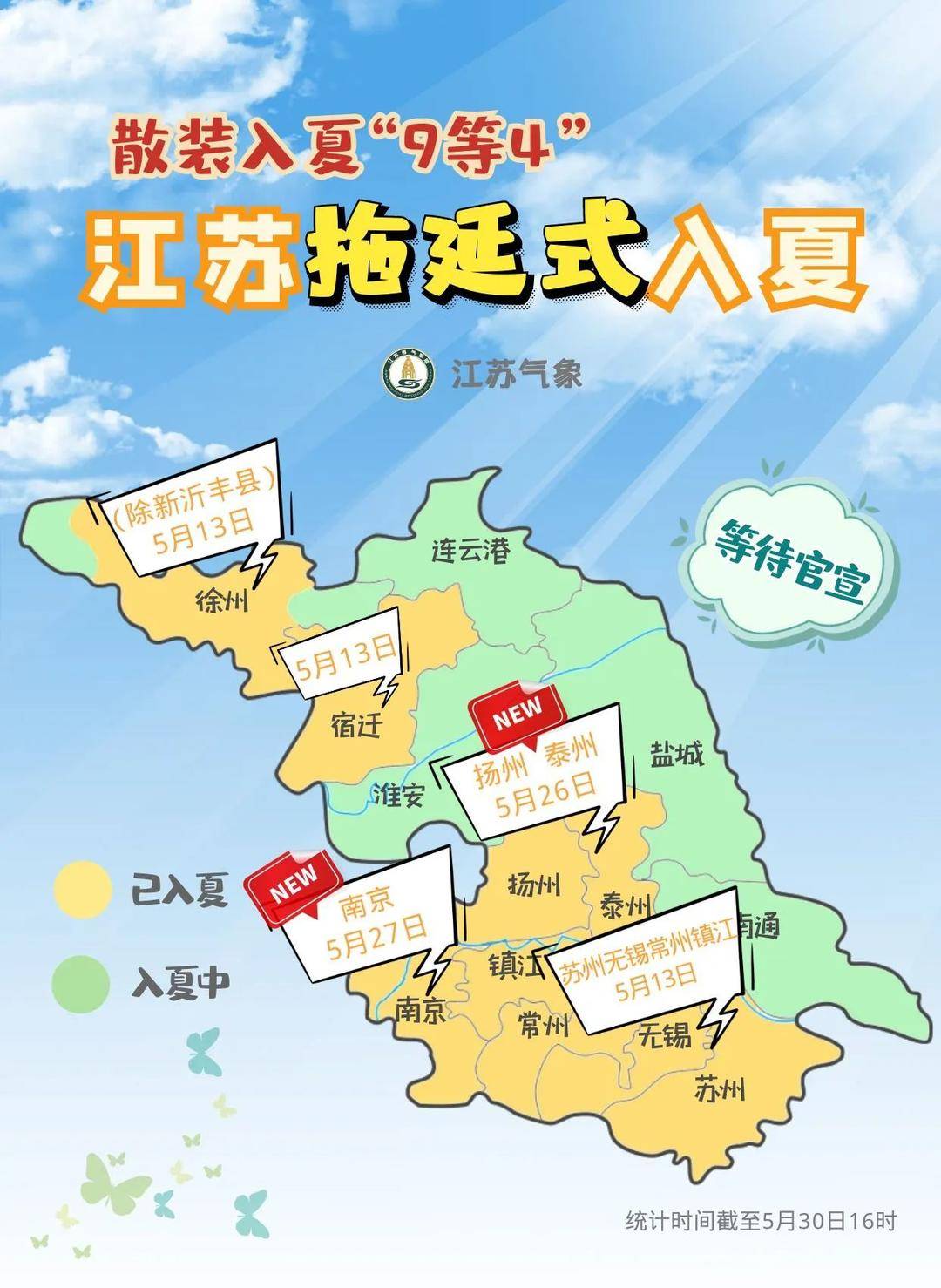 江苏入夏“大部队”有新成员加入,南京气象、扬州气象、泰州气象30日都官宣了“入夏”的消息。截至30日16时,还有四个城市还在持续监测中,散装入夏“9等4”,你们家入夏了吗?