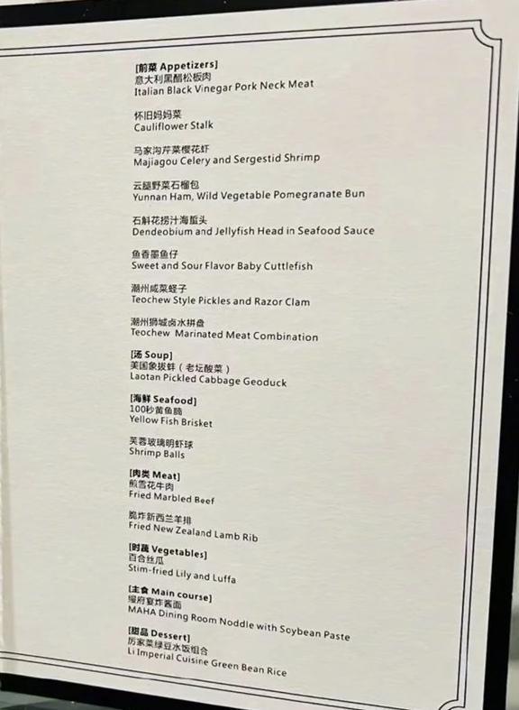 根据网上曝光的信息来看,马斯克当晚去的是华府会的缦府宴,据称这是北京的顶级会所。晚宴餐单也曝光,共有16道菜,包括意大利黑醋松板肉、怀旧妈妈菜、马家沟芹菜樱花虾、美国象拔蚌(老坛酸菜)、缦府宴炸酱面等。