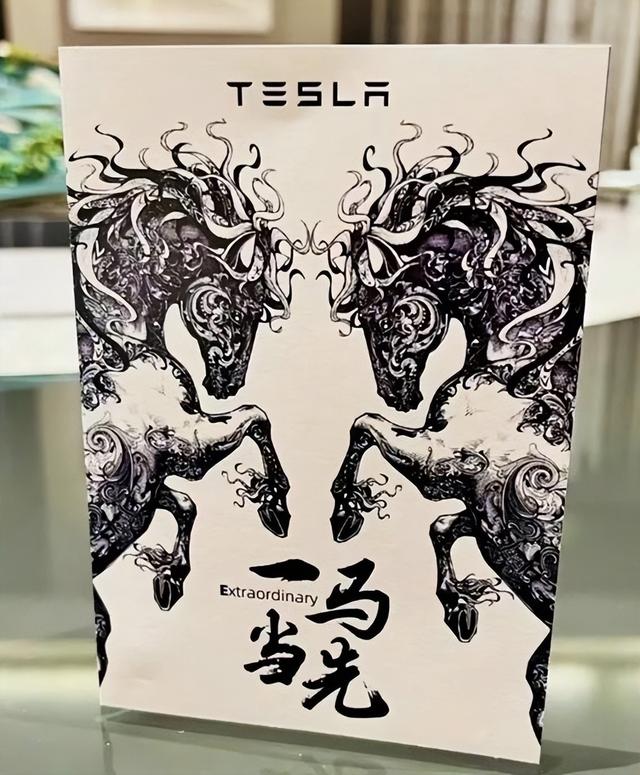 不得不说,晚宴的菜单含“马”量极高,封面相当讲究,两匹马占据了大部分位置,上方为英文“Tesla”,下方则是汉字“一马当先”与英文“Extraordinary”。菜单内页字母“E”十分醒目,并用中英双语介绍了“马”的含义,以及祝愿特斯拉在通往电动化的发展道路上以梦为马、横行万里。
